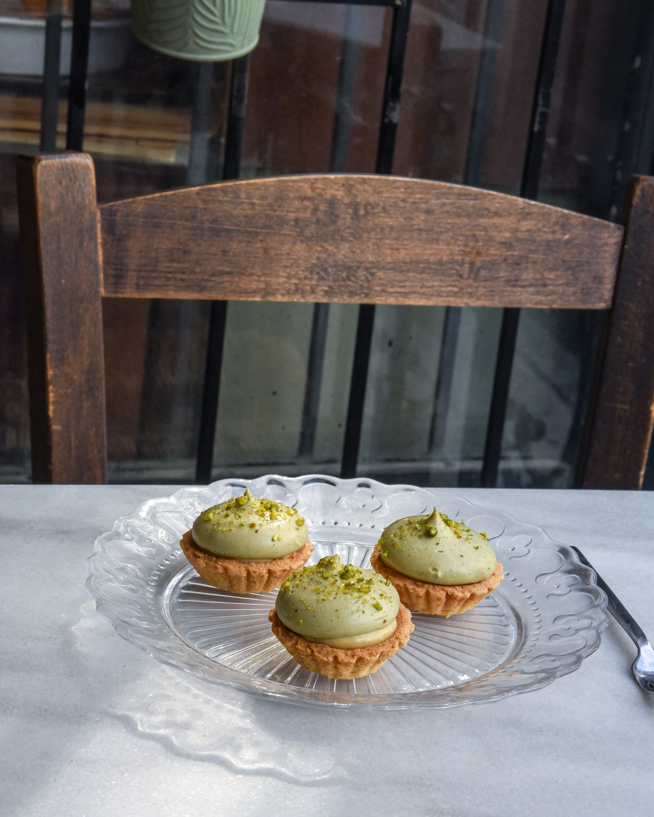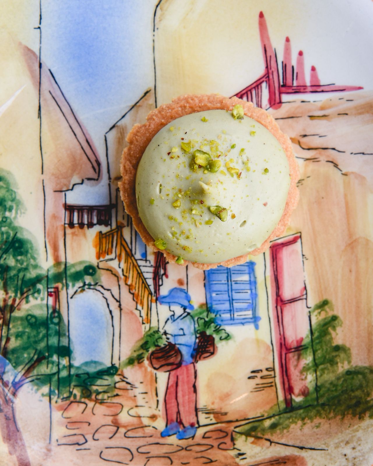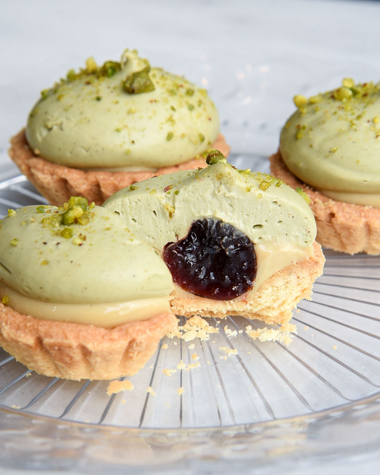 ταρτάκι με κρέμα από φυστίκι Αιγίνης ΠΟΠ, sauce sour cherry και βάση από φρεσκοψημένο χειροποίητο γαλλικό μπισκότο.(9 τεμάχια)