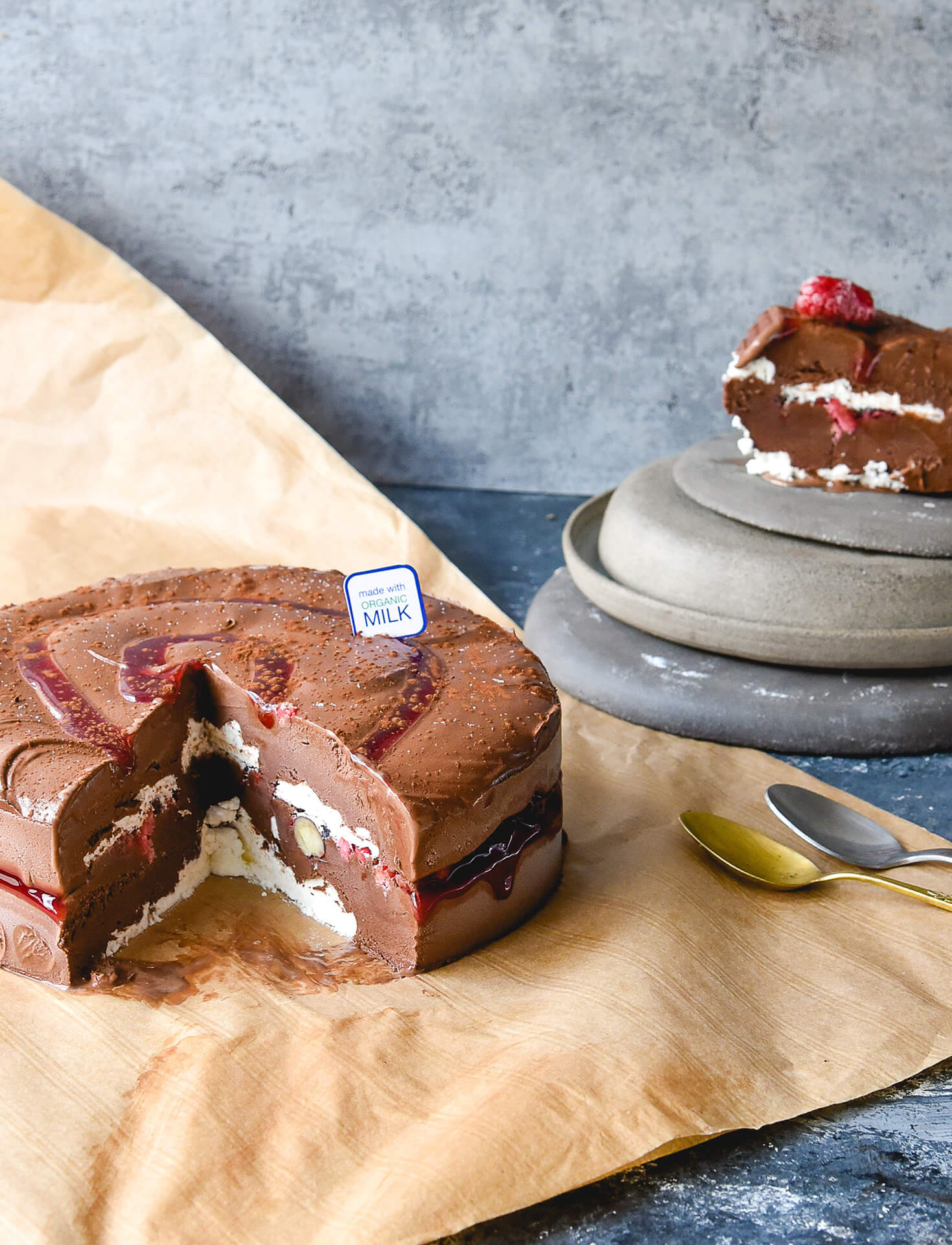 Χειροποίητο παγωτό από βιολογικό γάλα, με σοκολάτα υψηλής περιεκτικότητας σε κακάο, φρεσκοψημένες μαρέγκες και sauce από φρούτα του δάσους και φράουλες. 6 Ατόμων • Fresh Patisserie Signature Dessert.