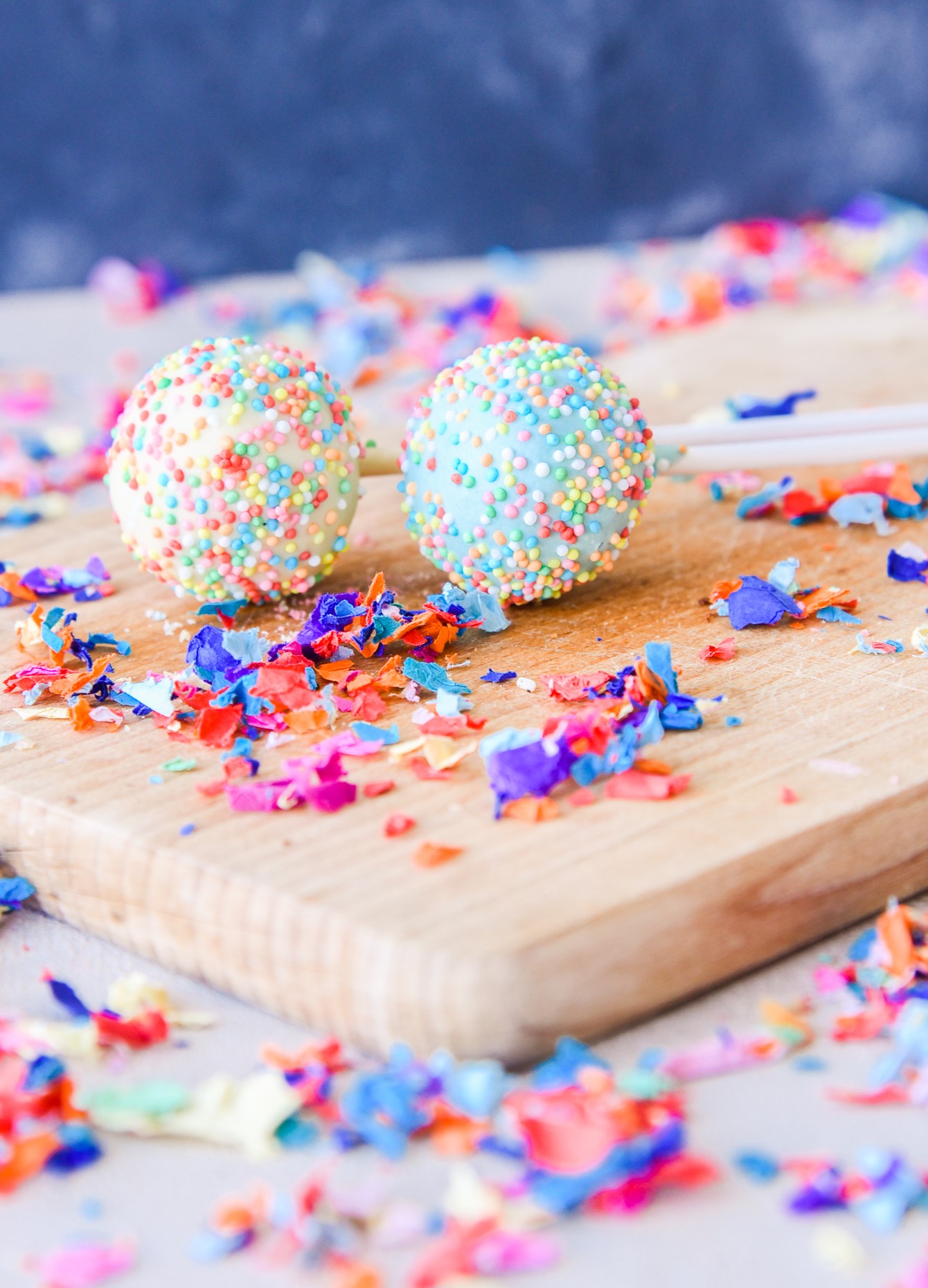 2 Cake Pops σοκολάτας γάλακτος με επικάλυψη λευκής σοκολάτας σε ροζ, κίτρινο και γαλάζιο χρώμα και sprinkles.
