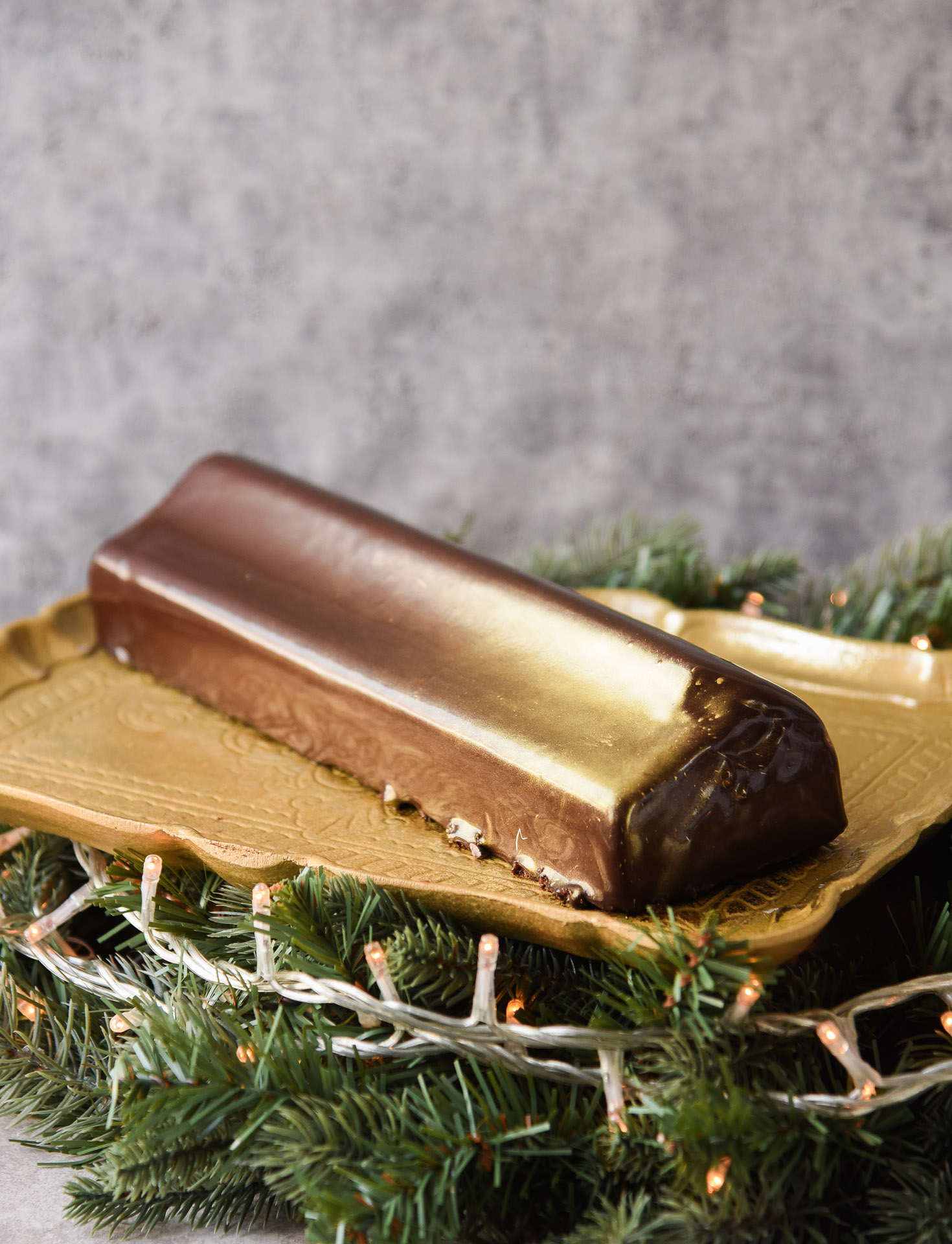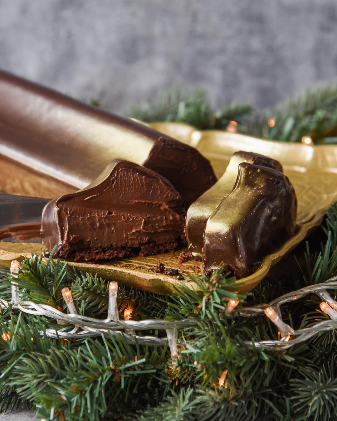 Χριστουγεννιάτικος Κορμός από mousse bitter με παντεσπάνι σοκολάτας εμποτισμένο με ρούμι, με επικάλυψη γλάσσο bitter, φύσημα χρυσού στην επιφάνεια και logo Fresh. (5-6 Ατόμων).