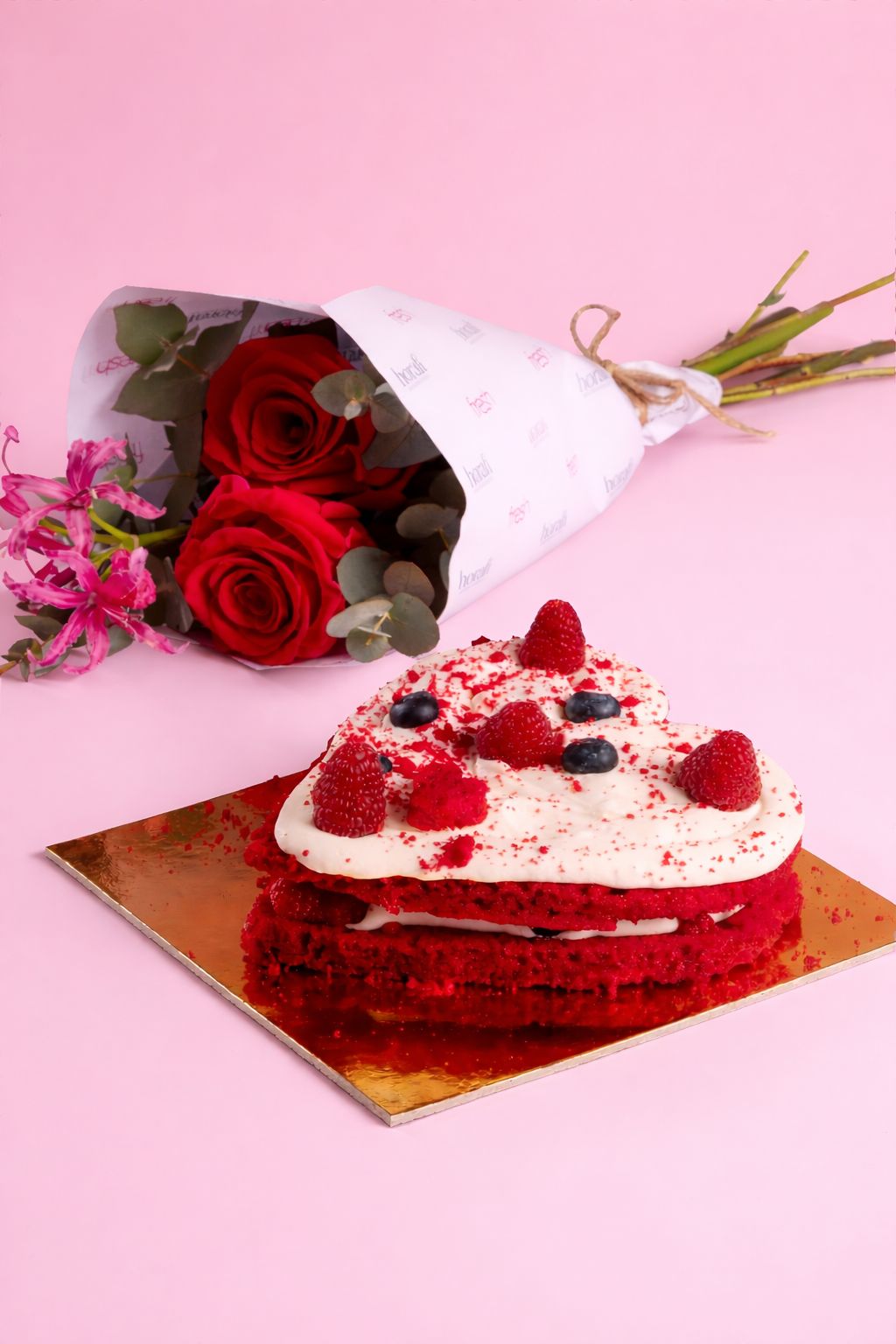 1 τούρτα Red Velvet αμερικάνικου τύπου, με χαρακτηριστική γεύση βανίλιας και ξινόγαλου με ενδιάμεσες στρώσεις από κρέμα mascarpone και φρούτα του δάσους μέσα στην επιφάνεια για 4-5 άτομα και εκλεπτυσμένη ανθοδέσμη που σχεδίασε το Horafi για τα Fresh, με προσεκτικά επιλεγμένα άνθη: τα χαρακτηριστικά τριαντάφυλλα Ecuador σε signature magenta απόχρωση και ανθισμένα νερίνια.