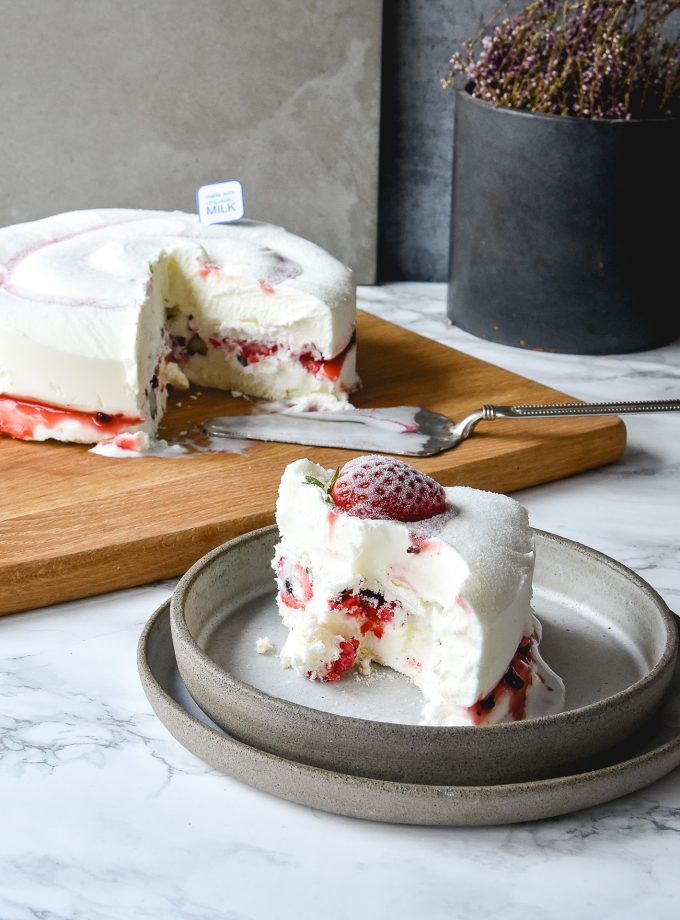 Τούρτα παγωτό από βιολογικό γάλα με κρέμα, φρεσκοψημένες μαρέγκες, sauce από φρούτα του δάσους και φράουλες.